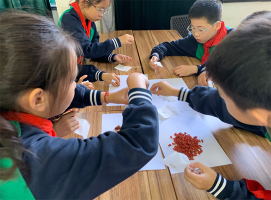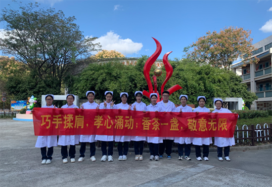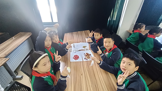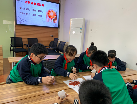 養生茶體驗環節更是氣氛熱烈。2506班的同學們準備了菊花、枸杞、紅棗等藥材,手把手教小學生們配制“養肝明目茶”。在一片歡聲笑語中,一杯杯暖心的養生茶氤氳著藥香,更傳遞著濃濃的敬老情誼。