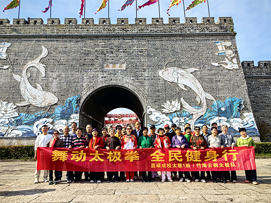 活動第一站,學員們來到了昌國衛古城。古城門墻繪著靈動的錦鯉與蓮花,古風建筑與文化元素交融,盡顯歷史韻味。學員們在古城門前再次集結,鮮艷的“舞動太極拳 全民健身行”橫幅與古樸的城門形成鮮明對比,既展現了太極文化的傳統底蘊,又彰顯了當代中老年人積極向上的生活態度。