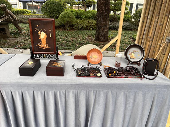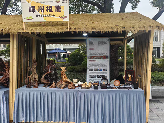 在杭州市龍塢茶鎮(zhèn)茶奧會現(xiàn)場,組織了浙江省中職學校特色專業(yè)非遺教學成果展。學校選送的多件木雕作品陳列有序,備受好評。其中,姿態(tài)飄逸的人物根雕巧妙地保留了木材的天然紋理和特性,展現(xiàn)出嵊州根雕獨特的藝術價值;與之相比,學生作品“嵊小籠”顏色鮮亮,憨態(tài)可掬,以年輕人更活力、時尚的方式展示嵊州的美食文化和特色產(chǎn)業(yè),與自然古樸的傳統(tǒng)根雕相映成趣;精巧的骨木鑲嵌作品將骨片的溫潤和木片的深沉巧妙結(jié)合,打造出柔和而雅致的藝術效果。