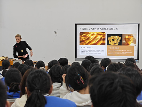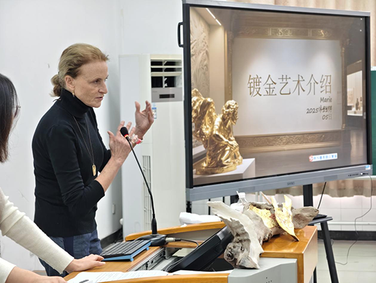 課程伊始,瑪麗老師通過精美的PPT為同學(xué)們講解了鍍金藝術(shù)的歷史。這一技藝最早可追溯至公元前2300年左右的古埃及,隨后在古代中國(guó)、古腓尼基、拜占庭等文明中均有應(yīng)用。當(dāng)一幅幅展現(xiàn)中國(guó)古代鍍金工藝精品的圖片呈現(xiàn)于眼前時(shí),同學(xué)們不禁發(fā)出由衷的贊嘆。