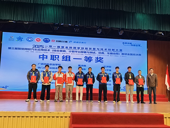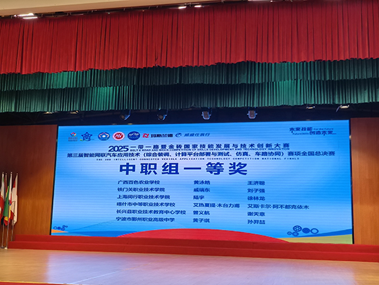 近日,2025一帶一路暨金磚國家技能發展與技術創新大賽第三屆智能網聯汽車應用技術(綜合裝調、計算平臺部署與測試、仿真、車路協同)賽項全國總決賽在安徽汽車職業技術學院圓滿落幕。寧波市鄞州職業高級中學(以下簡稱“鄞州職高”)王成波、孫航雨老師輔導的黃子琪、孫羿喆學生團隊從中職56隊參賽選手中脫穎而出,榮膺一等獎,彰顯了學校在智能交通技術領域的育人實力。