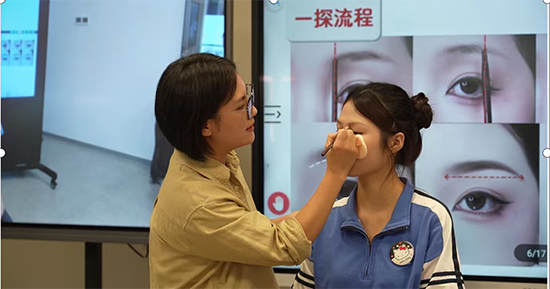 朱麗青老師獲獎課程聚焦學生最難掌握的眉形塑造問題,對傳統遠山眉進行創新改良,形成適配多數模特臉型的中式遠山眉設計。課程通過師生共研五字口訣、移動直播車同步示范、妙鏡系統實時呈現教學內容等信息化手段高效破解,同時,搭配AR動靜態造型游戲激發學習興趣,而校企合作開發的眉形游標卡尺,則讓眉形對稱難題有了實用解決方案。獨創的“三段五維度六方評價”立體式積分體系,讓教學評價及時高效,全方位助力學生提升技能。