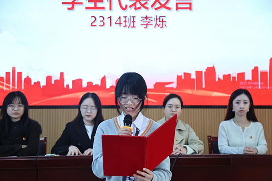 在中高職院校技能聯(lián)賽中獲得一等獎的2314班李爍作為團(tuán)員代表發(fā)言,分享了從理想信念的堅定到責(zé)任擔(dān)當(dāng)?shù)挠X醒的成長歷程,并向全體新團(tuán)員發(fā)出倡議:一要尊師友愛、誠實守信;二要深耕專業(yè)知識、學(xué)用結(jié)合;三要主動承擔(dān)社會責(zé)任,在奮斗中實現(xiàn)青春價值。