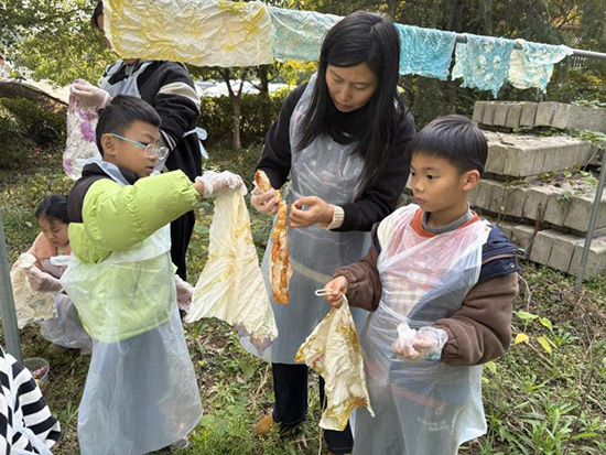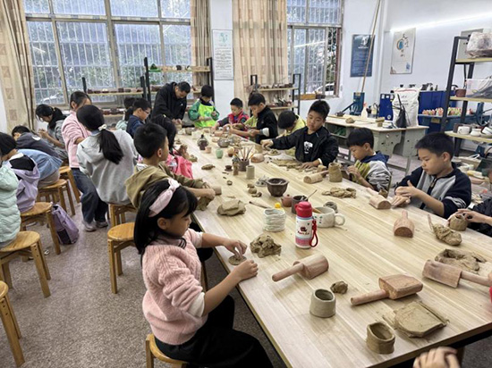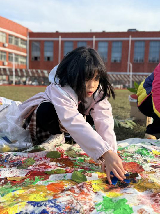 本次托管活動內容豐富,特色鮮明,充分利用了學校的專業優勢和資源。在系列活動中,孩子們先后體驗了陶藝制作、扎染工藝、竹編藝術以及科創項目等多種特色課程。他們不僅在工藝美術老師的指導下,與泥土對話,感受拉坯塑形的樂趣與匠人精神;也在服裝組老師的帶領下,親手扎染制作出獨一無二的團扇,領略傳統技藝的奇妙?;顒舆€特邀竹編工藝大師斯浙鵬親臨指導,讓小朋友們在動手實踐中加深對傳統文化的認知。此外,科創名師沈亞東老師和創客團隊的同學們為小朋友們開啟了一場“科創巡游”,引領孩子們走進科技的世界,感受智能制造、電腦編程和AI機器人的無限魅力,激發了他們的探索與創新熱情。系列活動的收官之作“操場長卷拓畫”,則讓孩子們在陽光下用樹葉和日常物品揮灑創意,長長的畫布上,拓印的不僅是樹葉的形狀,更是孩子們對這個秋天最鮮活的記憶,為秋假畫上了圓滿的句號。