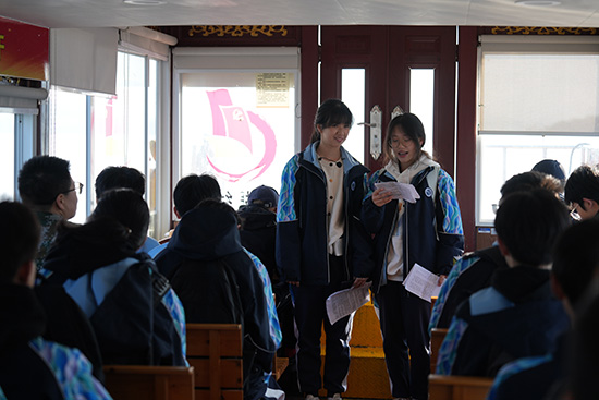 從湖濱碼頭乘船前往水上觀音碼頭,小導游們上崗講解,為同學們講解東錢湖的整體概況及陶公島、利民村等五個景點。從登船前的安全提示,到航程中的生動解說,再到靠岸后的整隊清點,每一個環節都由學生獨立完成。