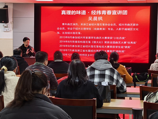 啟動儀式結束后,浙江省紹興蓮花落協會會員,紹興市曲藝家協會會員、宣講團成員吳晨楓開始“第一講”,他精心創作的紅色題材紹興蓮花落作品《真理的種子》與學院“真理的味道”品牌淵源深度契合。他強調,傳承紹興蓮花落,不僅是傳承一門古老的技藝,更是守護和傳遞一種精神。