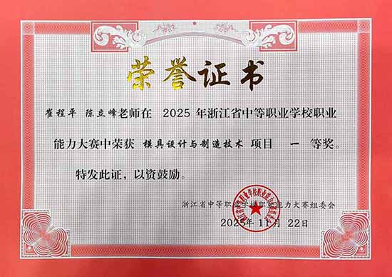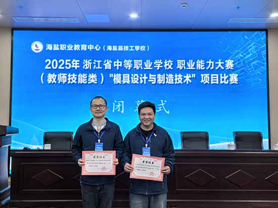 11月21日至23日,2025年浙江省中等職業學校職業能力大賽(教師技能類)“模具設計與制造技術”賽項圓滿落幕。來自全省10個地市的優秀機械專業教師同臺競技,經過激烈角逐,海鹽職業教育中心青年教師崔程平、陳立峰團隊,憑借扎實的專業功底和精彩的表現,榮獲團體一等獎(第1名)的好成績。