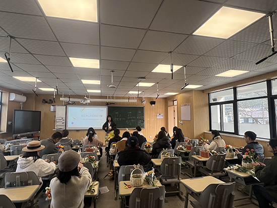 培訓中,章戰紅老師從插花的歷史文化、花材分類、工具使用等基礎知識入手,逐步深入到色彩搭配、空間構圖、意境營造等專業技巧。她通過現場演示與互動指導相結合的方式,生動講解了如何通過花藝表達自然之美與藝術韻律,并鼓勵教師們動手實踐,創作獨具個人風格的作品。活動現場花香四溢,氣氛熱烈,教師們沉浸其中,在剪插搭配間感受美、創造美。