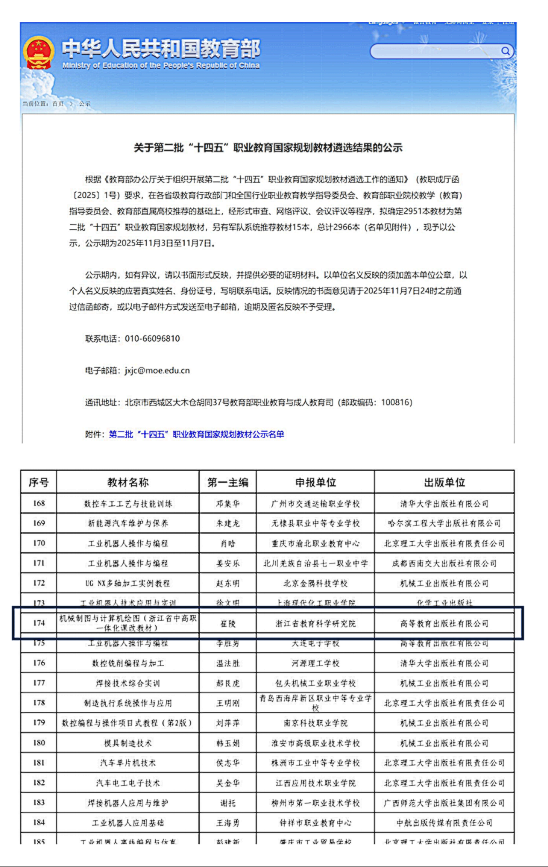 11月3日,教育部發(fā)布公告,對擬入選第二批“十四五”職業(yè)教育國家規(guī)劃教材名單予以公示。經(jīng)有關(guān)單位申報、形式審查、專項審核、網(wǎng)絡(luò)和會議評審、專家復(fù)核等程序,擬確定2951本教材為第二批“十四五”職業(yè)教育國家規(guī)劃教材,另有軍隊系統(tǒng)推薦教材15本,總計2966本。德清職業(yè)中專教師施國扣為主編、張愛為編委的《機械制圖與計算機繪圖》教材,作為浙江省中高職一體化課改成果教材,由高等教育出版社出版、浙江省教育廳推薦并成功入選!