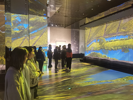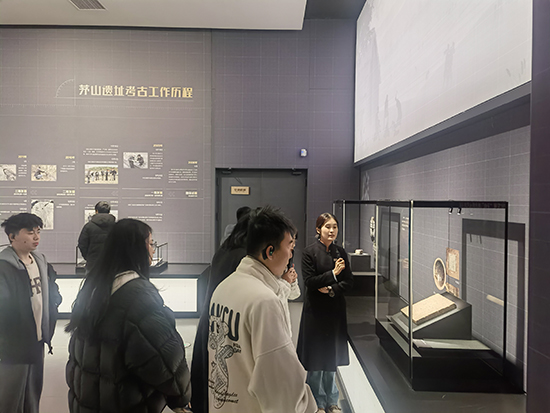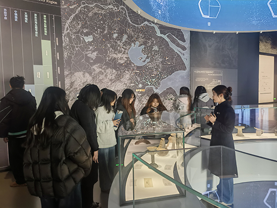 隨后,隊伍移步至“茅山遺址展廳”。該展廳集中展示了與良渚文化密切相關的珍貴遺存。面對一件件古樸精美的陶器、玉器,同學們駐足細觀,認真聆聽先民們的生產方式、社會組織與精神信仰,仿佛跨越千年,與古老文明展開了一場無聲卻深情的交流。