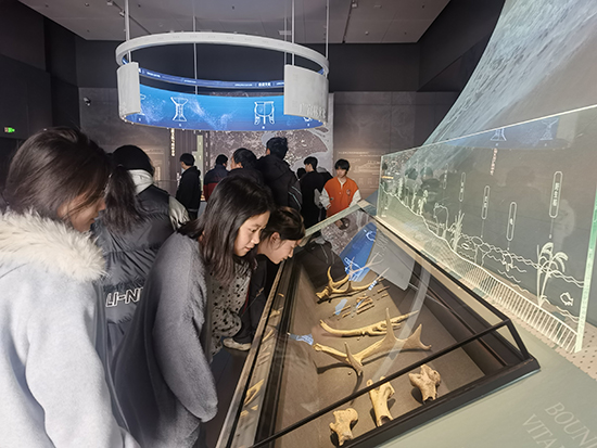 首站是“臨平遺址群展廳”。這里通過豐富的出土文物與詳實的圖文資料,全景式展現了臨平從新石器時代至夏商周時期人類活動軌跡與文明演進歷程,讓同學們對腳下這片土地的深厚積淀有了宏觀而深刻的認識。