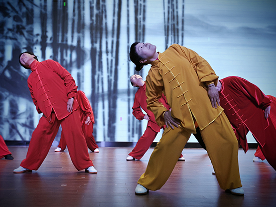 “朋友來了有好酒,若是那豺狼來了,迎接它的有獵槍”,在《我的祖國》伴奏下,太極劍扇合演則將濃濃的愛國情懷融合于劍的威猛與扇的飄逸中,剛?cè)岵g彰顯傳統(tǒng)武術(shù)的獨特魅力。