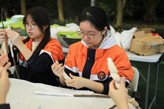 午餐時段,同學們走進梨樹林挑選枝條,親手將發酵面團制作成樹棍面包,現場烤制后品嘗自制的美味。大家在歡聲笑語中分享美食,進一步增進團隊默契,體會集體勞動的價值。