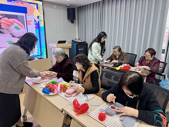 “阿姨們,要先抓出大概的羊毛量,再慢慢將羊毛用戳針戳刺出第一個造型,別一下子拿出太多,之后可以再拿一些羊毛繼續塑形,但大家要注意安全,帶上保護手指套,不要扎到手哦!”工作人員一邊巡視指導,一邊反復叮囑安全事項,耐心解答老人們遇到的問題。