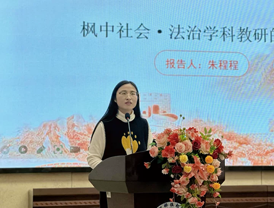 朱程程以《扎根“楓橋經(jīng)驗”,深耕鄉(xiāng)土思政——楓中社會·法治學(xué)科教研的路徑探索與實踐成果》為題作報告。她以“楓橋經(jīng)驗”為精神內(nèi)核與資源源頭,遵循“理論引導(dǎo)—實踐探索—文本凝練—成果輸出”的閉環(huán)路徑,系統(tǒng)推動鄉(xiāng)土資源向立德樹人鮮活教材轉(zhuǎn)化。在此過程中,學(xué)生實現(xiàn)從“傾聽者”到“擔(dān)當(dāng)踐行者”的成長,教師完成從“耕耘者”到“思想研究者”的蛻變,成功打通鄉(xiāng)土資源到育人成果的轉(zhuǎn)化通道。