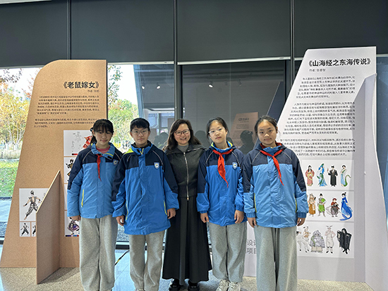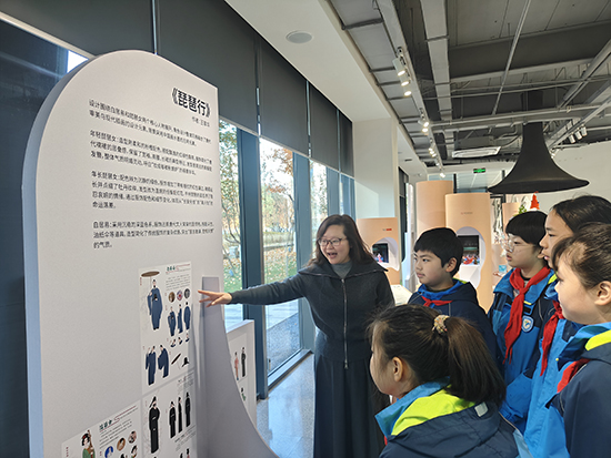 在上城區(qū)文化特派員張西琴的介紹下,孩子們的好奇心被徹底點燃。在《老鼠嫁女》展區(qū),大家圍著手稿追問苗族刺繡的寓意;看到《琵琶行》的服飾配色變化,有同學主動分享自己對詩句的理解。張西琴為孩子們搭建起通往專業(yè)藝術(shù)領(lǐng)域的橋梁,她結(jié)合展品細致拆解設計背后的文化內(nèi)涵與創(chuàng)作邏輯,讓孩子們讀懂蒙古族圖騰、唐代服飾形制如何與劇情深度融合,明白AI技術(shù)如何為傳統(tǒng)紋樣數(shù)字再生賦能。