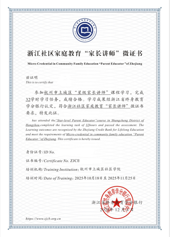 37張微證書不僅是家長成長的里程碑,更是引領和輻射區域家長終身學習的“第一粒星火”,從2017年的001號“星級家長執照”到今天的001號“家長講師”終身學習微證書,上城用八年時間書寫了家長教育的創新范本,實現從“執照”到“講師”跨越式突破,推動上城家校社協同育人邁向更專業、更系統的新紀元。(上城區社區學院)