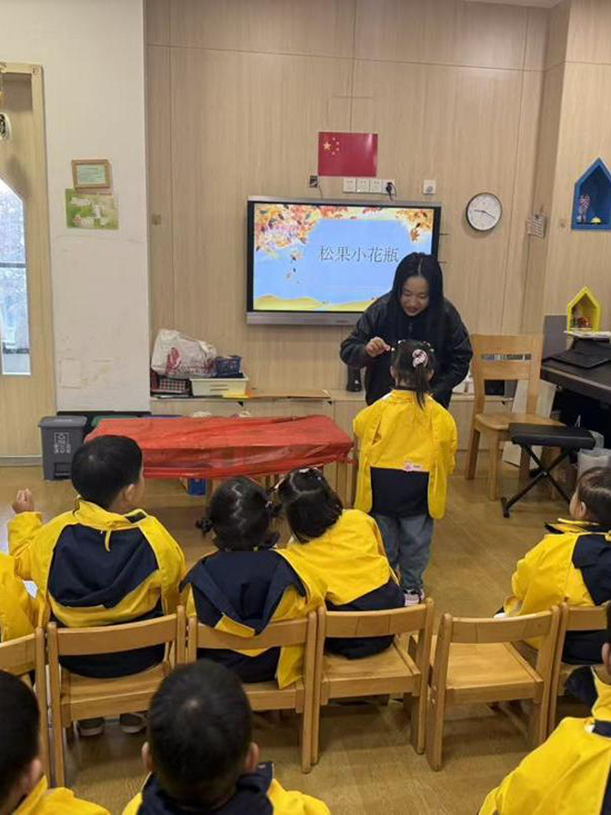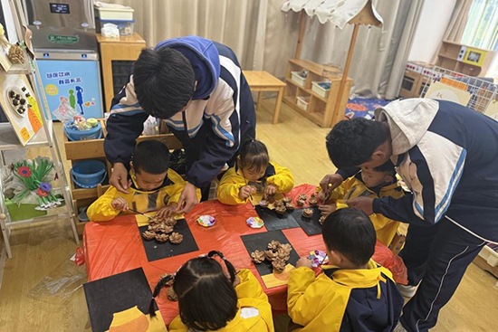 在五愛幼兒園中心園區,建筑專業的趙佳榕老師與同學們帶來了一堂特別的“松果裝飾課”。孩子們事先在校園、公園里收集來的松果,成為這節課最重要的“教具”。結合建筑室內裝飾的設計思維,師生們引導幼兒將松果修剪、涂色,再拼貼在手繪小畫板上。原本落地的松果,經過色彩點綴和創意布局,變成一幅幅獨具自然美感的裝飾畫。課程不僅鍛煉了幼兒的動手能力和色彩感知,也讓“廢物利用、創意生活”的美育理念悄然生根。