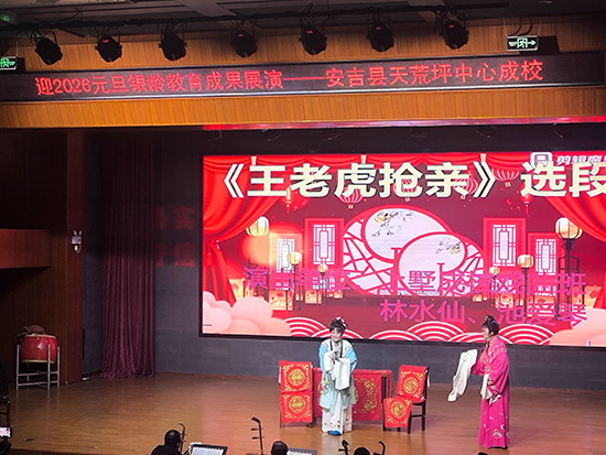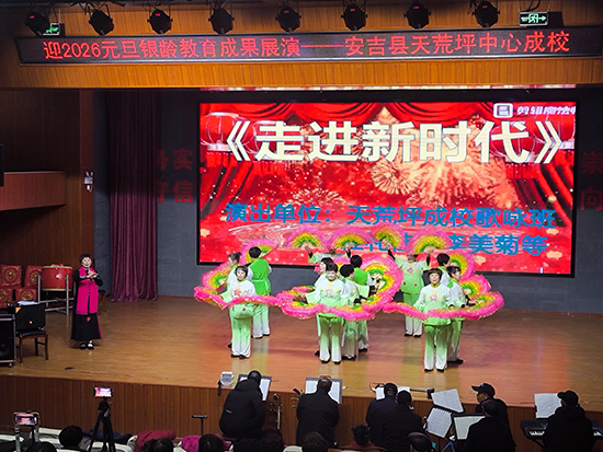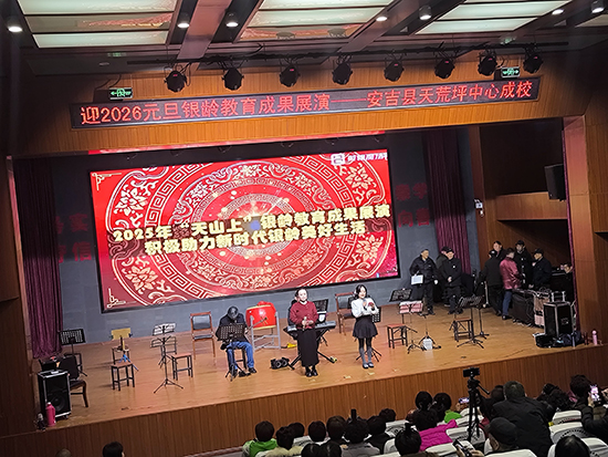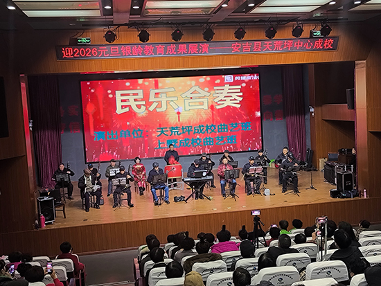 12月24日下午,安吉縣天荒坪鎮山河村文化禮堂內歡歌笑語、暖意融融,天荒坪中心成校“迎2026元旦銀齡教育成果展演”在此精彩上演。天荒坪中心成校及下屬上墅成校、山川成校的老年長班學員聯袂獻藝,近300名村民歡聚一堂,共賞這場充滿銀發活力的文化盛宴。