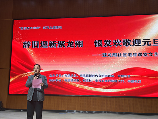 12月25日下午,梅溪村文化大禮堂內張燈結彩、暖意融融,“辭舊迎新聚龍翔,銀發歡歌迎元旦”迎元旦暨龍翔老年學堂年終文藝匯演在此溫情上演。本次活動由安吉縣社區教育學院梅溪分院(梅溪成校)、龍翔社區聯合主辦,多部門協辦,為轄區老年朋友獻上了一場精彩紛呈的文化盛宴。