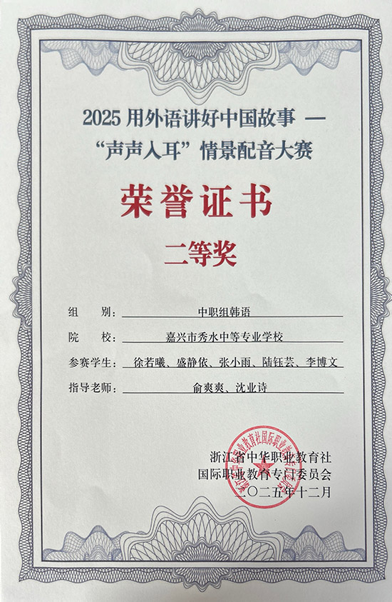 近日,2025年浙江省職業學校“用外語講好中國故事——‘聲聲入耳’情景配音大賽”圓滿落幕。嘉興市秀水中等專業學校韓、日、英三支參賽團隊在比賽中表現出色,共獲二等獎1項、三等獎2項。