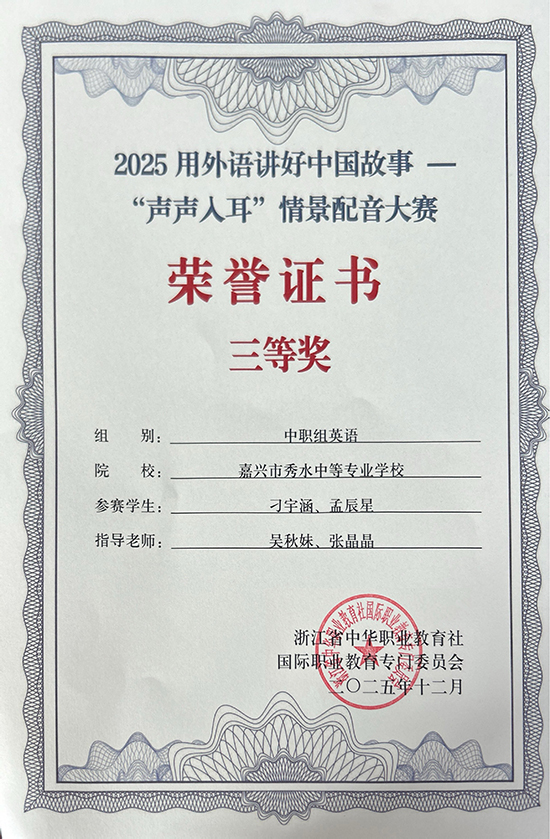 此次獲獎,是秀水中專長期堅持外語教學改革與跨文化育人成果的集中展現。同學們以扎實的語言功底、藝術感知與文化理解,在賽場上用自信的表達架起文明互鑒的青春橋梁。學校將繼續完善外語教學體系,拓寬實踐路徑,助力更多學子用外語向世界展現真實、立體、生動的當代中國。(俞爽爽)