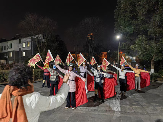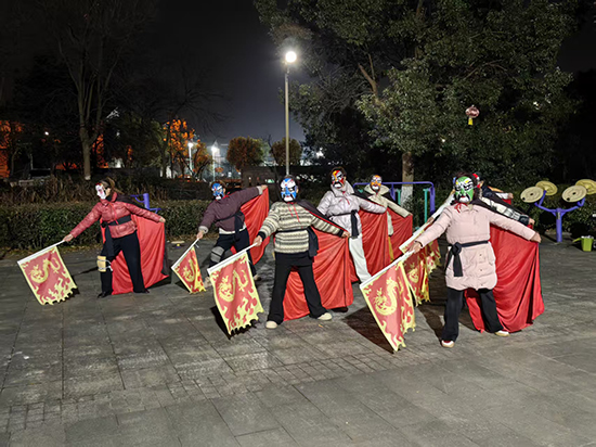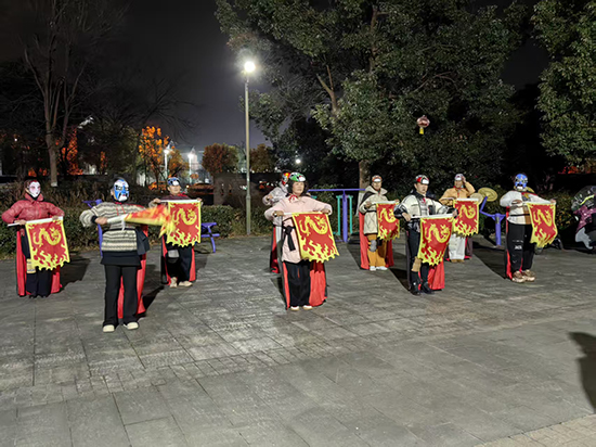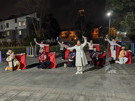 寒假雖至,安吉縣社區教育學院靈峰分院的校園外卻熱鬧依舊。1月上旬的夜晚,靈峰街道公園的健身廣場上,戲曲基本功進修班的老年學員們正跟著唐老師排練川劇變臉伴舞——她們身披紅綢、手持龍紋彩旗,臉上的戲曲臉譜與靈動的動作相映成趣,在路燈下勾勒出一道獨特的 “銀發風景線”。