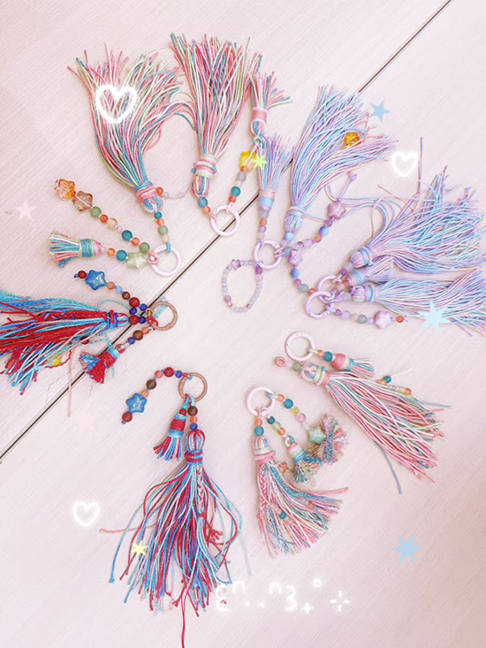 制作流蘇掛件的第一步,是選線。看著那一堆色彩各異的繩線,你可以根據自己的喜好,挑選出最讓你心動的紅粉撞色組合。接著是編繩環節,這可是個需要耐心與專注的過程。先把繩線整齊地排列好,按照教程,小心翼翼地開始編織。雙手熟練地穿梭在繩線之間,每一個動作都帶著一種節奏感,仿佛在演奏一首無聲的樂章。
