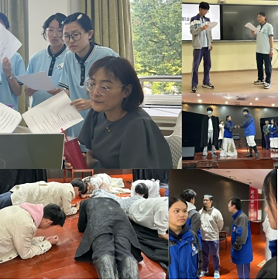 指導教師團隊更是全程護航。結束授課任務后,老師們便立刻投入排練指導,從劇本解讀、古英語校正到舞臺調度設計,每一個環(huán)節(jié)都親力親為。正如同學們回憶:“為了貼合中戲舞臺的呈現(xiàn)效果,老師帶著我們反復調整走位,直到所有人都找到最佳狀態(tài),常常忙碌到忘記休息。”這份對藝術的較真與對學生的負責,正是臨平職高教師風采的生動體現(xiàn)。