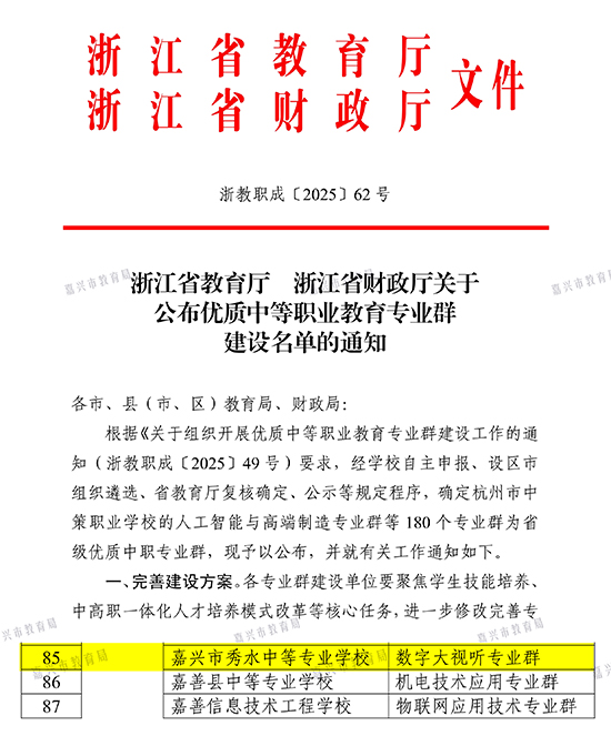 近日,浙江省教育廳、浙江省財政廳正式公布浙江省中職優(yōu)質(zhì)專業(yè)群立項名單。嘉興市秀水中等專業(yè)學(xué)校申報的“數(shù)字大視聽專業(yè)群”經(jīng)過嚴(yán)格評審,成功入選,標(biāo)志著學(xué)校在專業(yè)建設(shè)與人才培養(yǎng)方面邁上新臺階。