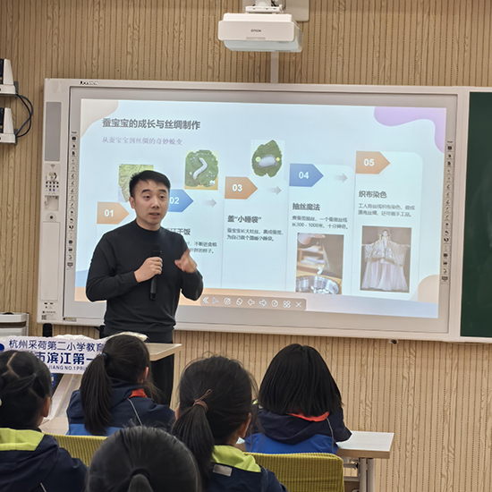 課堂上,黃新建化身專業(yè)的文化傳播者,從嫘祖養(yǎng)蠶的古老傳說娓娓道來,沿著絲綢起源的歷史脈絡(luò)徐徐展開,講到古絲綢之路的駝鈴聲聲,再延伸至絲綢在現(xiàn)代服飾、家居、文創(chuàng)等領(lǐng)域的多元用途。生動的講述搭配鮮活的案例,讓孩子們聽得津津有味,目光里滿是好奇。