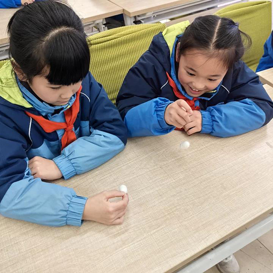 最讓孩子們興奮的,當(dāng)屬“絲綢七兄弟”觸摸體驗(yàn)環(huán)節(jié)。綾、綢、錦、紗、羅、緞、繡七種面料整齊陳列在課桌上,孩子們迫不及待地伸手觸摸,感受著綾的輕薄飄逸、錦的華麗精致、緞的柔滑細(xì)膩,不時發(fā)出陣陣驚喜的贊嘆。“原來絲綢有這么多種類,摸起來的感覺完全不一樣!”一位同學(xué)興奮地和同伴分享著自己的發(fā)現(xiàn)?;顒蝇F(xiàn)場,文化特派員還分發(fā)了蠶繭供孩子們觀察觸摸,捧著圓滾滾的蠶繭,孩子們圍在一起熱烈討論,好奇探尋著它蛻變?yōu)楣饣z綢的奧秘,一雙雙眼睛里滿是對傳統(tǒng)文化的向往。