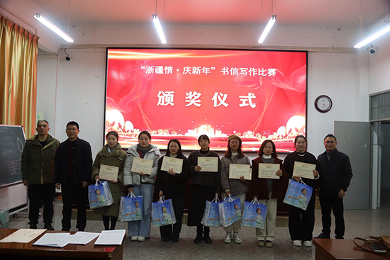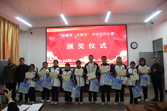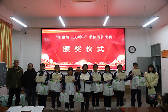1月15日晚上,浙江省慶元縣職業高級中學階梯教室洋溢著溫馨熱烈的氛圍,“浙疆情,慶新年”兩校書信寫作比賽頒獎儀式在此隆重舉行。中國郵政慶元分公司總經理雷偉軍、慶元職高校長張發等嘉賓出席儀式并為獲獎者頒獎。