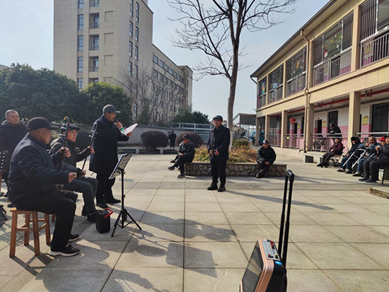 演出現場暖意融融,二胡班師生們精神矍鑠,輪番演繹《喜洋洋》《茉莉花》等經典曲目。悠揚的琴聲縈繞庭院,時而激昂明快,時而溫婉綿長,引得老人們紛紛拍手附和,不少老人還跟著旋律輕輕哼唱,臉上滿是欣慰笑容。