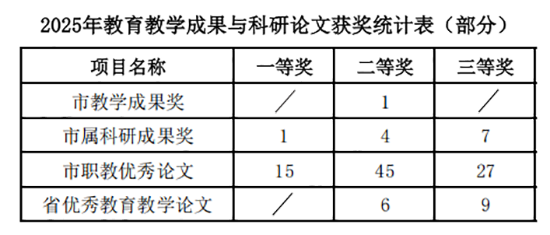 成果評優與案例引領同步突破:成果評優中,獲市教學成果獎二等獎1項、市屬級教育科學研究優秀成果12項。案例評選中,獲中國民辦教育協會優秀案例2項,省級中職教育改革優秀典型案例1項,市級教育改革優秀典型案例1項、典型案例1項,“嘉禾職教·可見教研”優秀案例4項、典型案例2項。論文評選方面,市職教優秀論文獲獎86篇,獲獎率超90%;省優秀教育教學論文獲獎15篇。