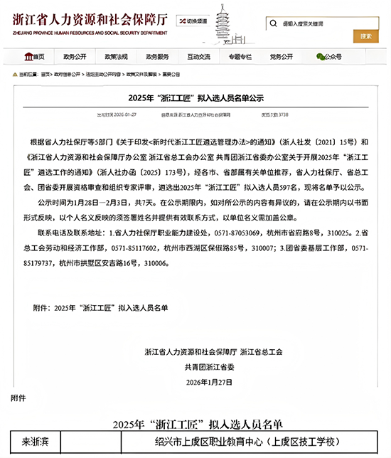 近日,浙江省人力資源和社會保障廳、省總工會、共青團浙江省委聯(lián)合公布2025年“浙江工匠”入選人員名單,上虞區(qū)職業(yè)教育中心來浙濱老師歷經(jīng)層層選拔,脫穎而出,為學校再添一位“浙江工匠”。