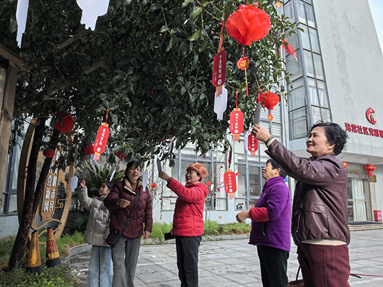 活動從猜燈謎開始。新碶街道社教中心海棠分中心院子里的樹枝上掛起了紅彤彤的小燈籠,每個燈籠下都垂著一張紅色謎條。“‘一塊變九塊’,打一成語——我知道,是‘四分五裂’!”戴著橙紅色帽子的曹阿姨摘下謎條,樂呵呵地前去兌獎。穿著紅棕色皮衣的顧阿姨和她的孫女各自挑著自己感興趣的謎條,認真琢磨著謎底,由于研究得太投入,雙方都不由自主走散了。