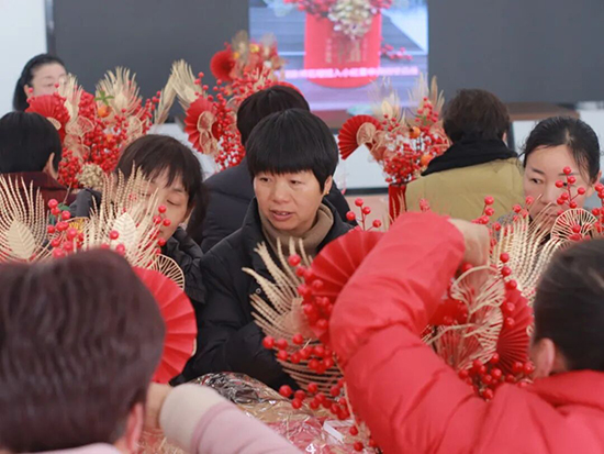 “大福桶DIY”將活動推向高潮。在工作人員的細致示范下,大家精心挑選紅果、銀杏、福卡、掛飾等材料,親手制作寓意“福氣滿桶”“紅運當頭”的新春福桶。現場氣氛熱烈,大家互相交流插配技巧,齊心協力將一只只福桶裝點得紅紅火火、獨具特色。指尖流轉間,一件件年味濃郁、匠心獨具的作品陸續完成。這不僅是一場生動的手工創作,更是一次沉浸式的新春文化體驗,老人們在專注創作與友好協作中,真切感受親手創造美好的喜悅,讓對幸福生活的向往變得更加真切可感。