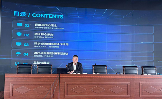 他強調,AI教育已從興趣課升級為面向全體學生的通識教育,師生要具備AI認知、使用、倫理、創新四大核心素養,堅守育人初心、應用為要、人機協同、技術適配四大原則。校長從備課、課堂、課后輔導、育人管理全流程,指導教師規范、安全、高效運用AI工具,并就數據安全、過度依賴、版權審核等風險作出強調。他號召全體教師積極參與培訓、從痛點場景試點、形成人機協同備課模式,將AI應用納入校本研修,善用國家智慧教育平臺資源。他指出,教育的未來是人機協同的智慧育人,全體教師要以技術賦能教學,在變革中實現專業成長,成就每一位學生。