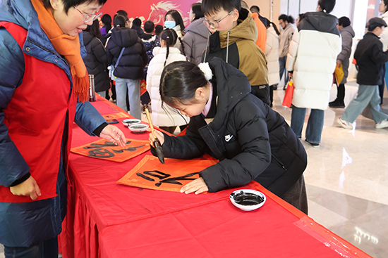 2月7日,系列活動的首站在人流如織的平湖吾悅廣場溫暖啟幕。在商場濃厚的迎新春氛圍中,學院書法班的師生們擺開書案,現場揮毫,為往來市民免費書寫并贈送“福”字與春聯。他們以嫻熟的書法技藝,將人們對丙午馬年的憧憬與對美好生活的向往,凝注于一筆一劃之中。求“福”字、選春聯的市民絡繹不絕,將書寫臺圍得水泄不通。紅紙黑字,翰墨馨香,為繁華的商業中心注入了一份典雅而溫暖的傳統年味。師生們公益奉獻的熱情和精湛的書法技藝,贏得了市民們的連連稱贊,讓中華傳統文化的魅力在“煙火人間”生動綻放。