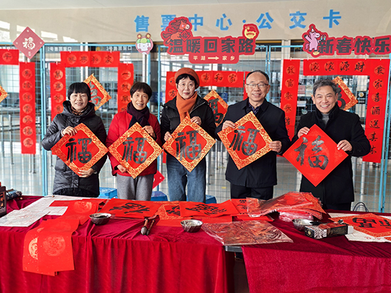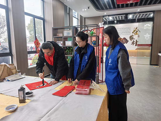 書(shū)法班、書(shū)畫(huà)創(chuàng)作班的十幾位學(xué)員于學(xué)期結(jié)束前,在龔國(guó)銘老師的帶領(lǐng)下,著手開(kāi)展寫(xiě)春聯(lián)活動(dòng)。自12月下旬開(kāi)始到2月中旬,共組織了近40場(chǎng)送福送春聯(lián)活動(dòng)。為機(jī)關(guān)、學(xué)校、銀行、老年公寓、鄉(xiāng)鎮(zhèn)、村、社區(qū)、殘聯(lián)、企業(yè)等共書(shū)寫(xiě)春聯(lián)3800多對(duì)、福字近5000個(gè)、迎春對(duì)聯(lián)軸300多軸、福牌和掛件1000多塊,為廣大市民送上真摯的新年問(wèn)候,以筆墨傳溫情、書(shū)香賀新春,傳遞美好祝愿。