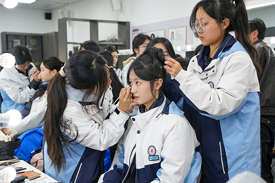 美發與形象設計專業師生聯合企業妝造導師,提前打磨定制妝造造型,打造出干練職場風、雅致新中式、復古摩登風、圣潔婚紗風等多款特色造型。拍攝過程中,化妝師們第一時間觀察鏡頭中妝面的呈現效果,及時上前為模特補妝、修整發絲,讓妝造與光影、場景達到最佳契合。