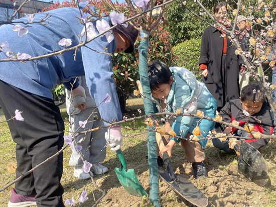 在“澆”個朋友植樹環節,各小組領取樹苗和工具后,便興致勃勃地投入到勞動中。爺爺認真揮著鐵鍬,奶奶細心扶著樹苗,孩子們則有模有樣地填土。他們默契配合,共同種下充滿希望的小樹苗,并鄭重地掛上認養牌。這不僅僅是種植一棵樹,更是栽下了一份關懷、一份責任與一份跨越年齡的承諾。