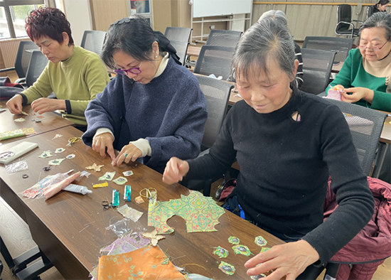 理論講解結束后,居民們迅速投入創作,裁剪、黏膠、拼接,每一個步驟都認真細致、一絲不茍。遇到困難、拼接不平整等問題,老師俯身耐心指導,手把手糾正手法;居民們也相互交流技巧、分享經驗,歡聲笑語間,陌生感悄然消散,課堂氛圍溫馨而熱烈。