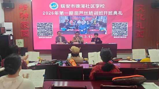 3月13日晚,春夜微涼,瑞安市錦湖社區學校文化大禮堂內卻暖意融融、燈火通明。在丙午馬年這個象征著奮斗與希望的春天,2026年第一期葫蘆絲培訓班開班典禮在此隆重舉行。眾多葫蘆絲愛好者與文化志愿者們歡聚一堂,共同開啟一段嶄新的音樂之旅。典禮由班長葉小琴主持。
