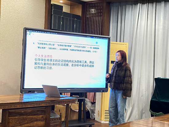 喬司職高徐威儀老師通過對比高二統測與近三年人人賽試題,指出兩類考試均注重情境化與思辨性,主觀題占比不斷提高。她結合學情指出,學生在信息提取、論證邏輯、批判思維等方面存在短板,建議以專題教學、情境賦能、互文閱讀為抓手,在復習中兼顧基礎鞏固與思維訓練,將能力培養融入閱讀與寫作教學全過程。
