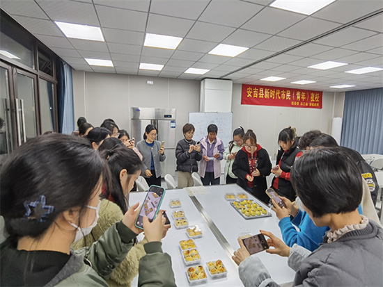 經過近2個小時的精心制作,一盤盤金黃油亮、外皮酥脆的蛋黃酥新鮮出爐,整個培訓現場香氣四溢。學員們捧著自己親手制作的蛋黃酥,迫不及待品嘗起來,一邊吃一邊笑著感嘆:“四個太少了,根本不夠吃,還是自己做的最香、最合口味!”簡單的話語里,滿是收獲的喜悅和對本次培訓的認可。(陳麗春 黃雙誼)