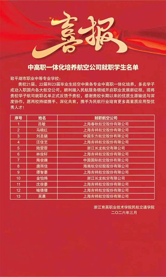 近日,浙江育英職業(yè)技術(shù)學(xué)院向平湖市職業(yè)中等專業(yè)學(xué)校發(fā)來《中高職一體化培養(yǎng)航空公司就職學(xué)生名單》喜報(bào):13名21屆、22屆、23屆畢業(yè)生成功入職國(guó)內(nèi)各大航空公司。這份喜報(bào)滿載榮光,既是對(duì)學(xué)校學(xué)子拼搏奮進(jìn)的最高褒獎(jiǎng),更是對(duì)兩校合作辦學(xué)成果的權(quán)威認(rèn)可。自2015年攜手開辦航空服務(wù)中高職一體化五年制教育以來,十年耕耘,匠心育人。一批批心懷藍(lán)天夢(mèng)的學(xué)子從這里啟航,在萬米高空書寫青春華章。