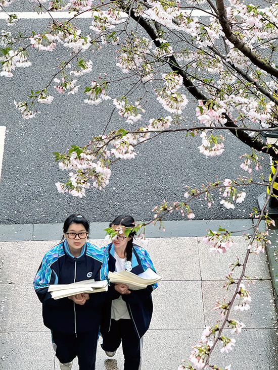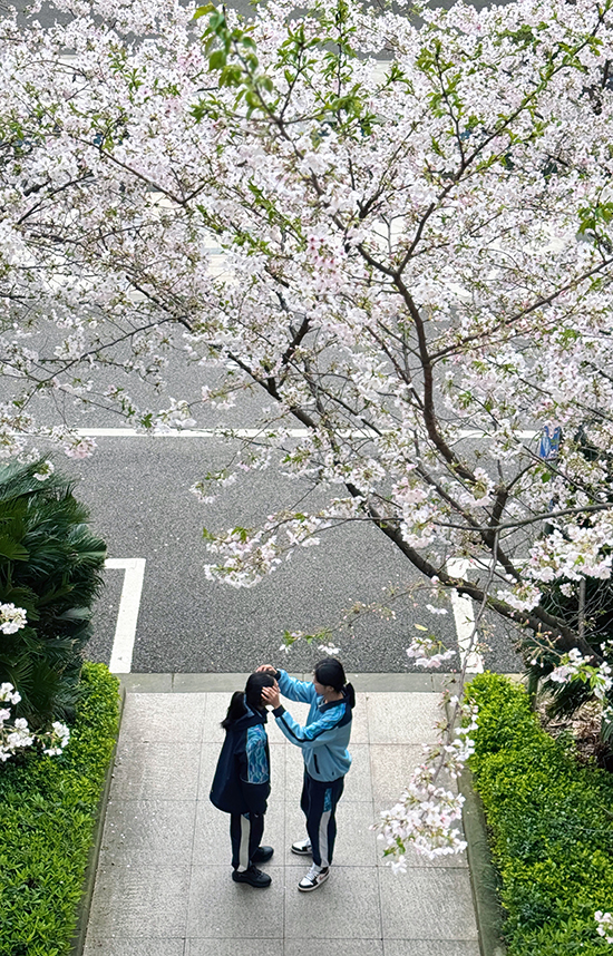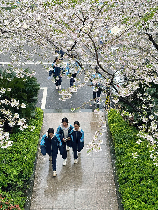 課間,師生紛紛駐足拍照,用鏡頭定格春日的美好。一條鋪著灰色石板的小徑貫穿花海,兩側綠灌木整齊列隊,幾位女生結伴而行,長發女孩低頭專注書本,側身女孩笑意盈盈與同伴低語,另一人輕松翻閱筆記,步伐輕快,仿佛將課堂的書香也帶入了這自然的課堂。小徑盡頭,更多學生或三五成群合影留念,或獨自坐在櫻花樹下靜心閱讀,任花瓣輕輕落在書頁上。遠處車輛緩行,與這靜謐校園構成一幅動靜相宜的春日畫卷。