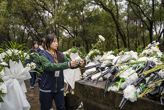 默哀儀式結束后,同學們依序步入紀念碑前,分批向英烈敬獻鮮花。一束束潔白的菊花,承載著對革命先烈的深切追思與崇高敬意。同學們輕步上前,俯身獻花,每一個動作都飽含虔誠。這不僅是一次獻花儀式,更是一場跨越時空的對話——先烈們用生命守護的山河,今日由青年一代接續守望。